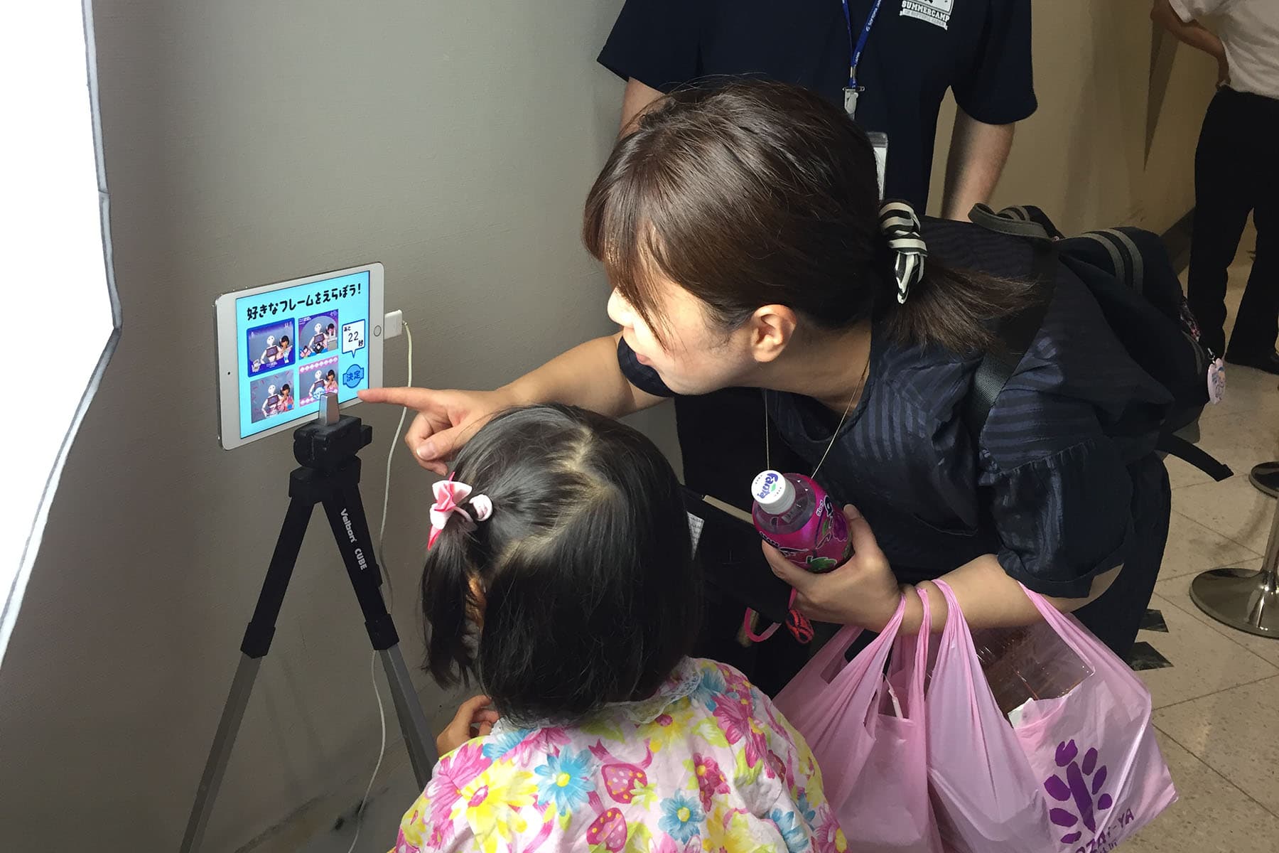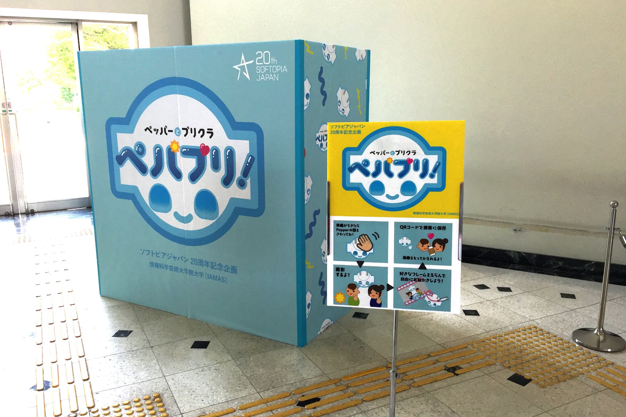 Pepperと一緒に写真を撮り、iPadアプリ側で写真をデコレーションしたあと、QRコードから読み取って持ち帰ることができます